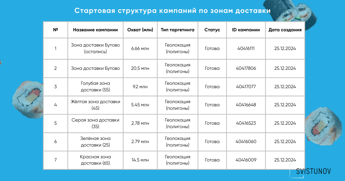 - Задействовали зоны доставки: отрисовали их в Яндекс.Аудитории до запуска и попросили УК исключить эти зоны из показов.
