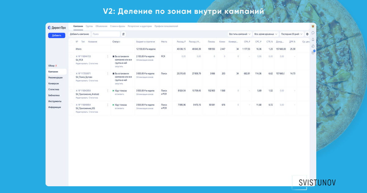 После этого реализовали деление по зонам внутри кампаний по группам. Кампании разделили по площадкам: поиск, РСЯ, приложение Android и iOS. Это сработало лучше первого варианта.