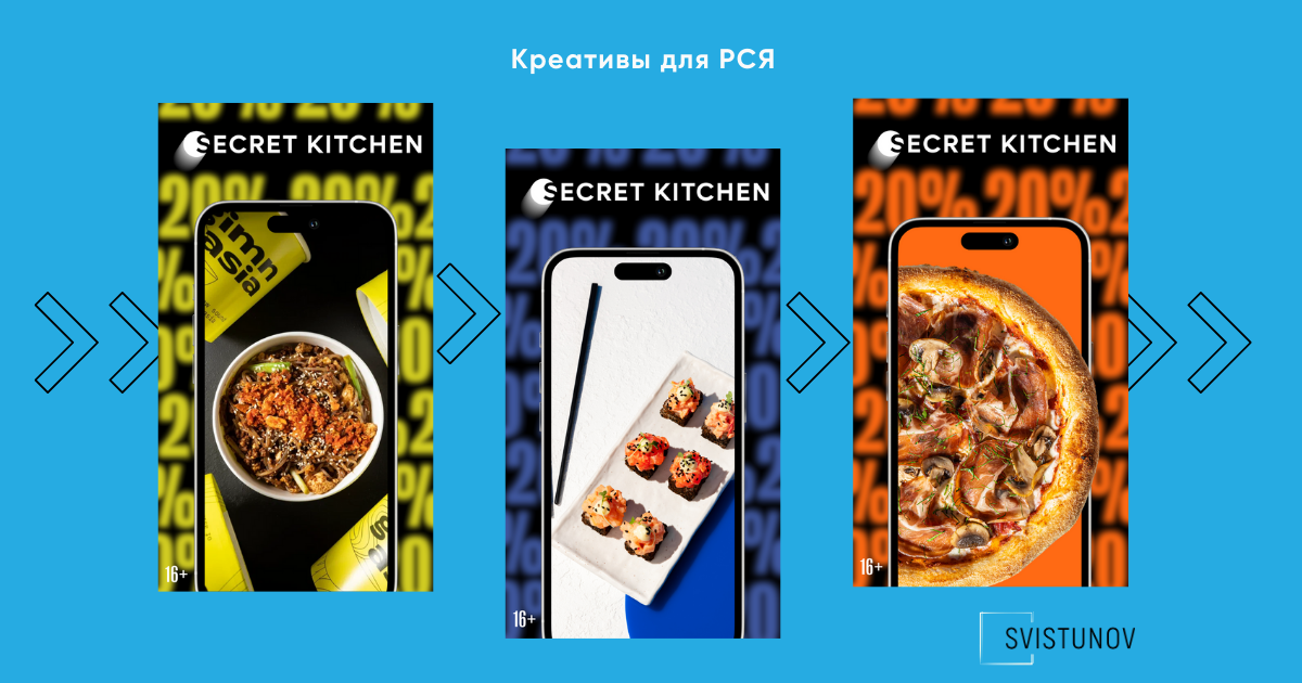 - Создали креативы под каждую кухню: итальянская, японская, паназиатская, стритфуд.