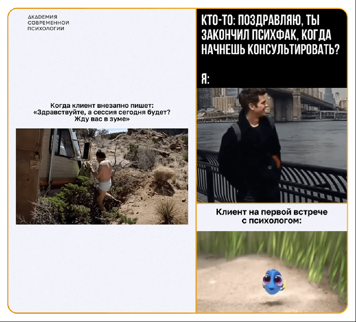 2. Сделали два угла подачи — про комьюнити и про практические инструменты/разборы: «Психологи для психологов» как сообщество, развитие и профессиональная среда, и "Современный формат" с разборами кейсов, сериалами и персонажами, прикладными инструментами.