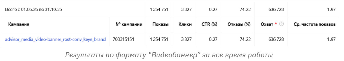 Формат «Видеобаннер» отработал хуже, чем просто баннеры или видеоформаты. По нему мы получили более низкий охват и объем ЦД, чем с других форматов, поэтому от данного формата отказались после непродолжительного периода тестирования.