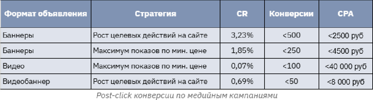 В качестве канала для генерации post-click конверсий даже на стратегиях, которые, по сути, не предназначены для этого, мы все равно получили, пусть и небольшой, объем целевых действий, но их CPA в несколько раз превышал CPA баннерных кампаний.
