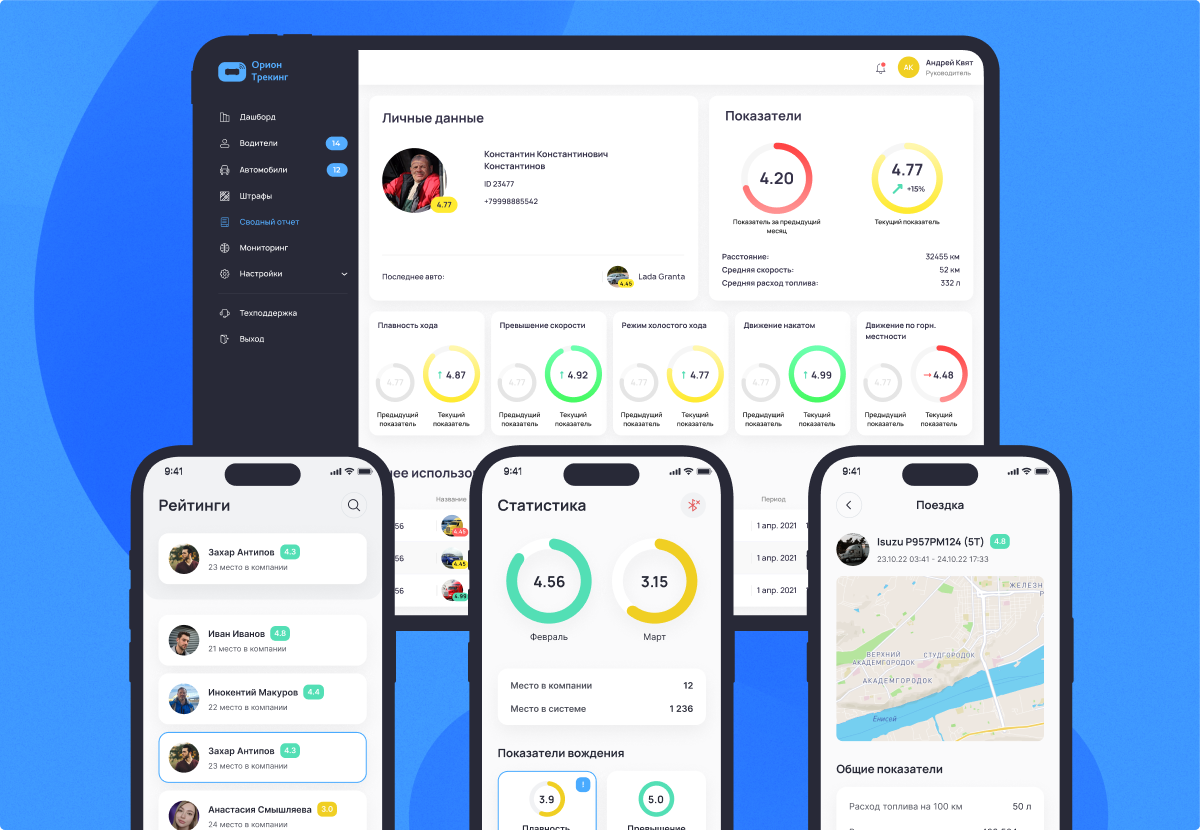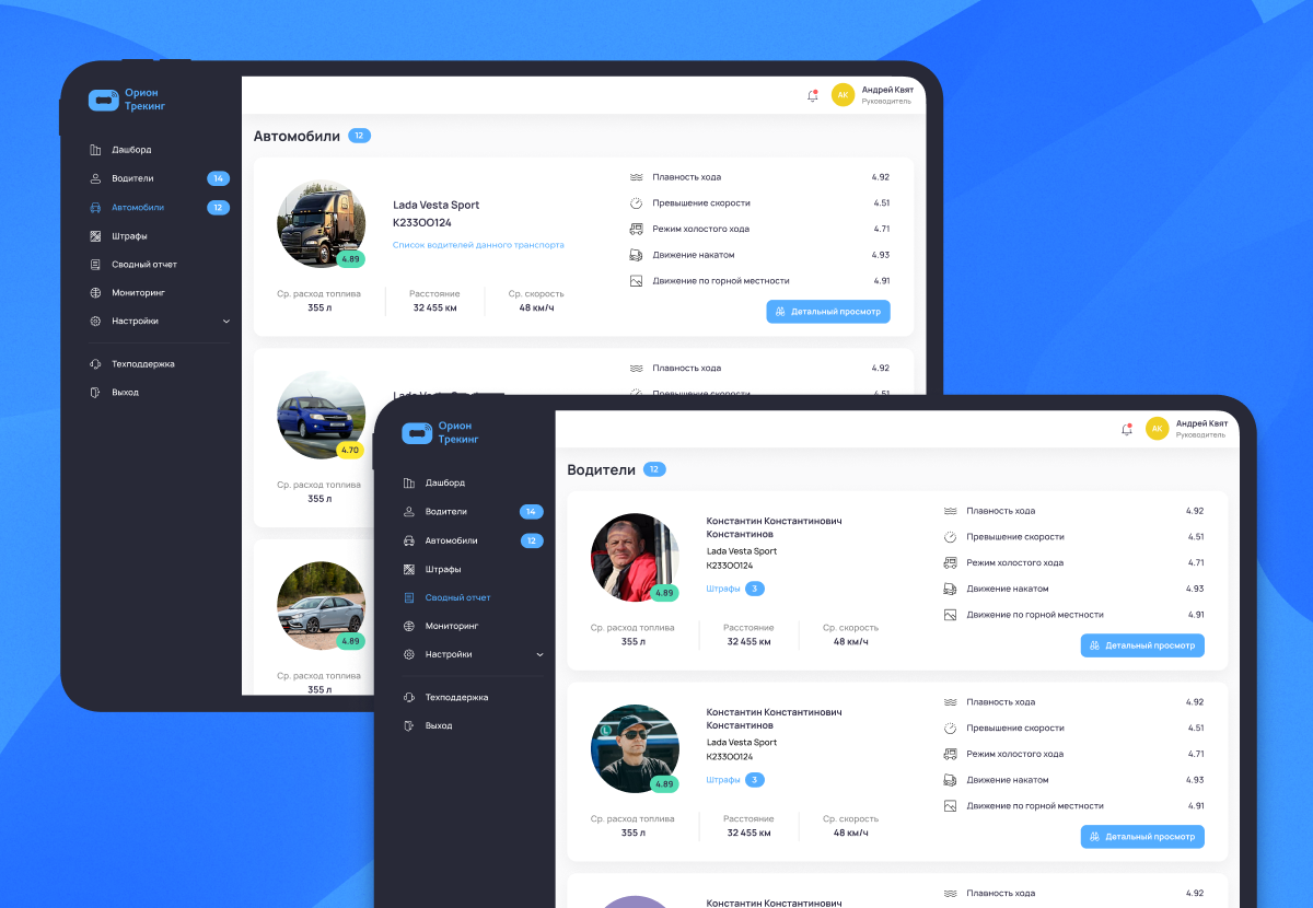 - дашборды водителей с подробной информацией и рейтингом, детализированные карточки транспортных средств.