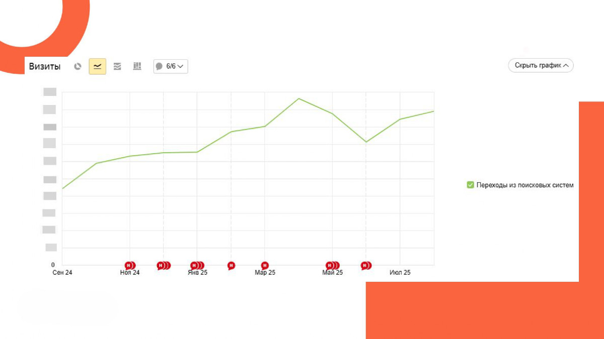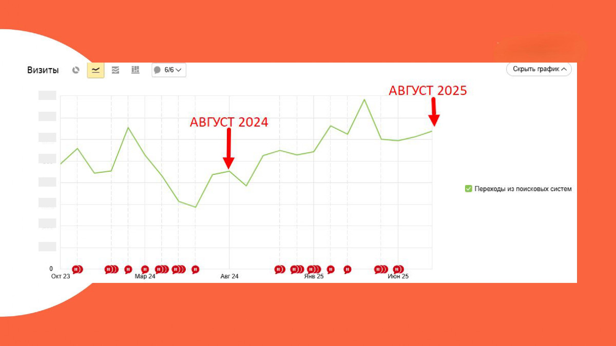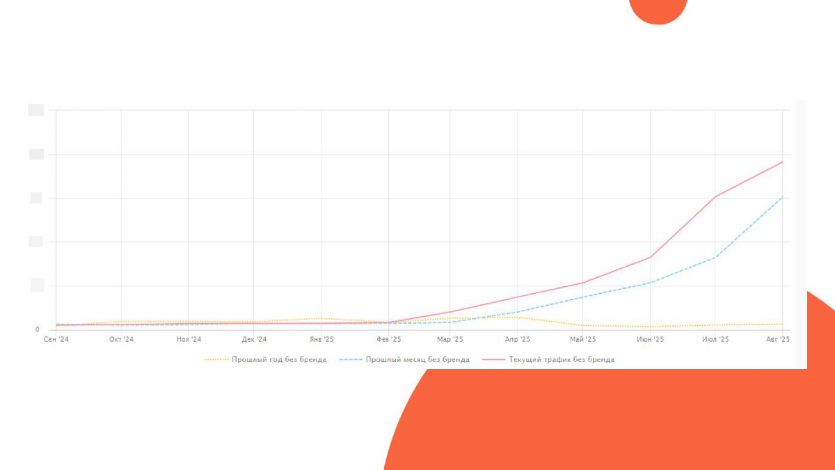 В результате SEO-продвижения визиты по небрендовым запросам демонстрируют стабильный рост: к августу 2025 года количество уникальных посещений увеличилось в 2 раза. Это подтверждает, что улучшения структуры сайта и контента не только повышают позиции в поисковой выдаче, но и реально вовлекают пользователя, превращая органический интерес в активные визиты и потенциальные покупки.