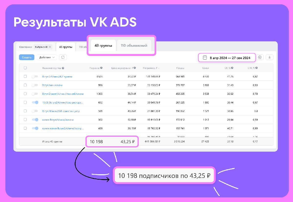 Протестированные 110 креативов и 43 сегмента ЦА говорят сами за себя: поиски работающих связок, масштабирование лучших и отключение неуспешных, переход с минимальной на предельную оптимизацию требуют постоянной включенности.