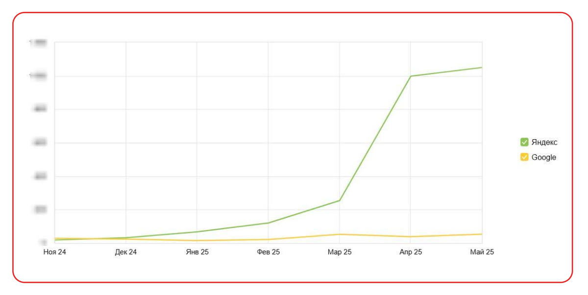Параллельно улучшаем UX — навигацию, фильтры, карточки и структуру страниц, чтобы пользователям было проще находить нужные решения. Это обеспечивает стабильный рост органического трафика и повышает конверсию в обращения.