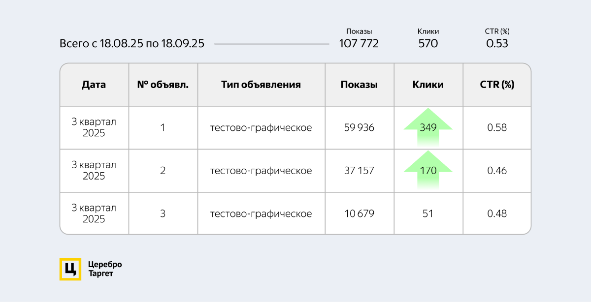 Нам важно было оценить какие креативы отработают лучше, а какие — хуже. В данном случае видно, что самые кликабельные объявления — 1 и 2. Последний вариант уступает им более, чем в 3 раза.