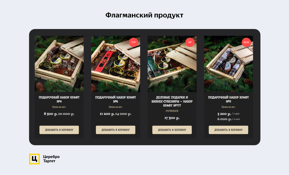 - Реклама должна крутиться на подарочные наборы, которые стоят выше 5 000 руб. Это позволит привлекать продажи в рамках KPI.