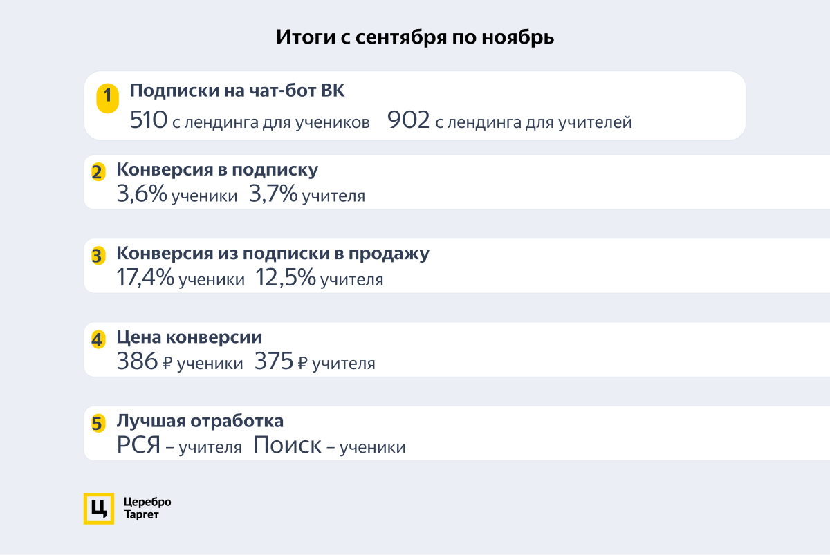 Суть теста — оценить потенциал продвижения методических материалов для преподавателей в несезон. Всего за месяц протестировали РСЯ, ТГ и Поиск, получили первые продажи и нашли работающую связку.
