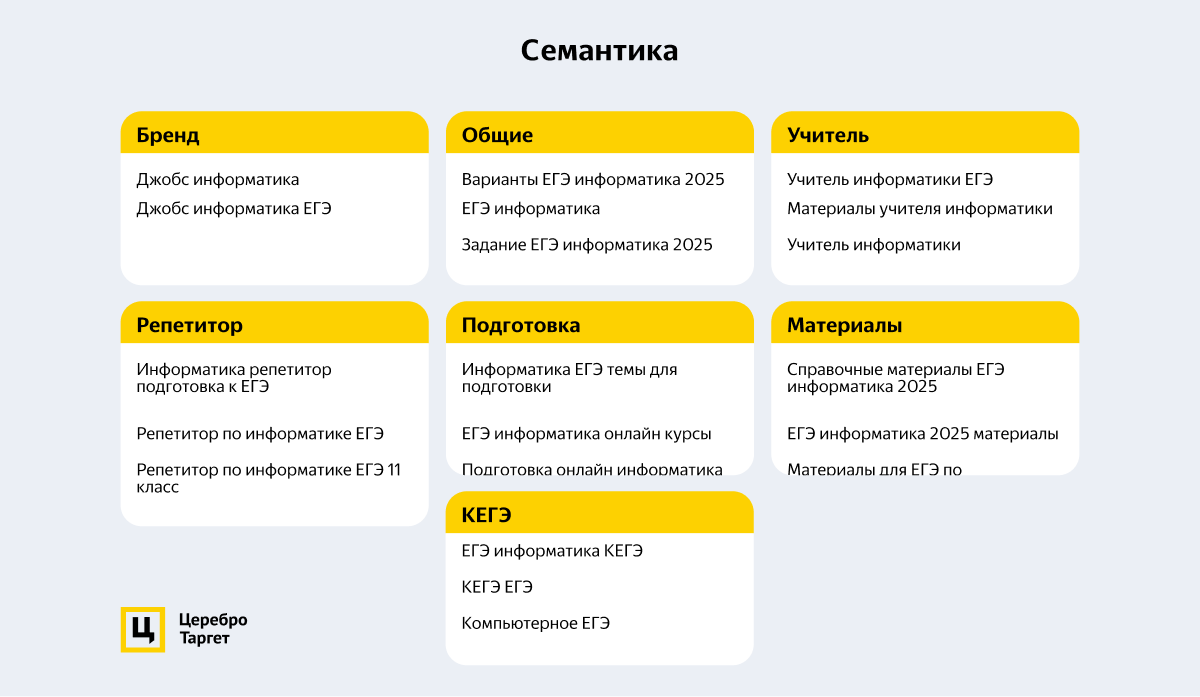 Нас интересовала аудитория учителей и репетиторов, которые готовят к ЕГЭ-2026 по информатике. Сегмент аудитории сам по себе достаточно узкий, а для периода низкого спроса тем более. Поэтому при сборе семантики ориентировались на высокочастотные запросы, такие как: подготовка к ЕГЭ по информатике, репетитор по информатике, комп ЕГЭ информатика и т.п.