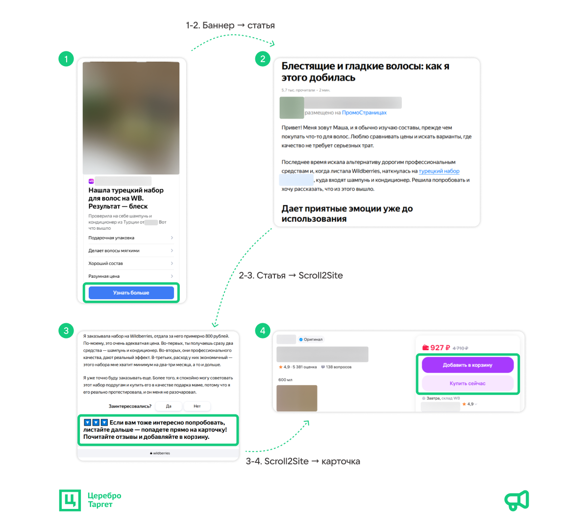 ЯПС — это сервис для продвижения статей в Рекламной сети Яндекса и на Поиске. Пользователь видит рекламное объявление на сайте, кликает по нему и открывает статью. Дочитывает ее до конца, листает дальше и автоматически переадресовывается на посадочную страницу бренда — карточку товара в нашем случае.