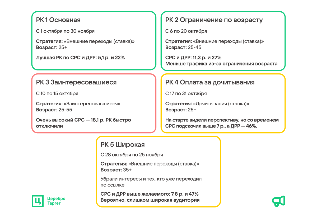 Вывод. Для турецкого бренда уходовой косметики самой рабочей оказалась РК 1, где мы установили оплату за переходы на карточку, возрастное ограничение 25+, ГЕО, устройства для показа рекламы, интересы ЦА и т. д. На базе этой рекламной кампании можно было масштабироваться.