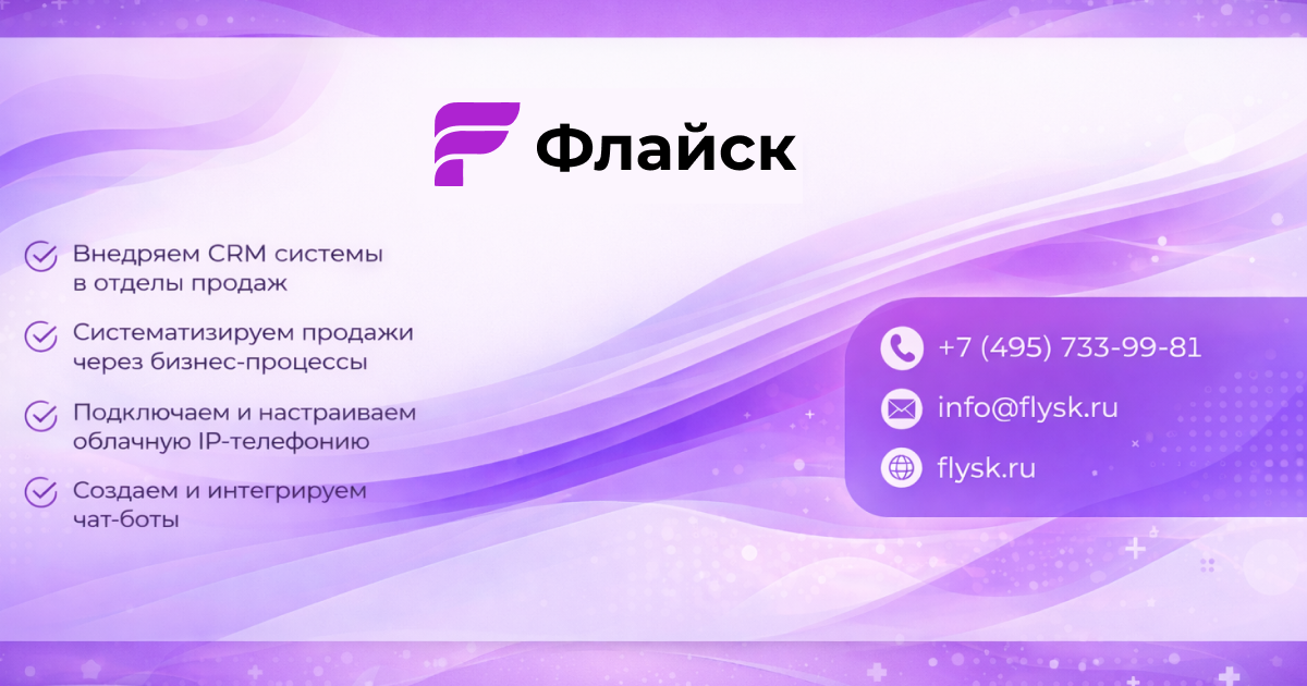 Флайск – интегратор и разработчик программных продуктов для автоматизации отделов продаж. Наша компания настраивает управление продажами за счет систематизации бизнес-процессов - это позволяет максимально снизить человеческий фактор в продажах. В результате ваши сотрудники будут больше продавать и приносить прибыль, а не тратить время на рутину.