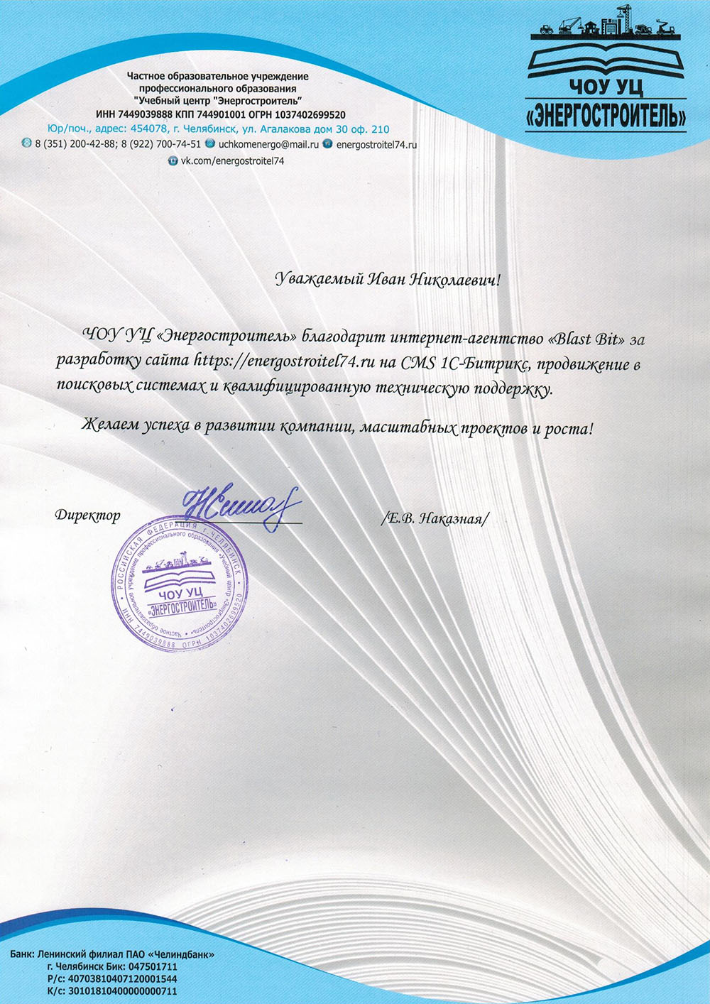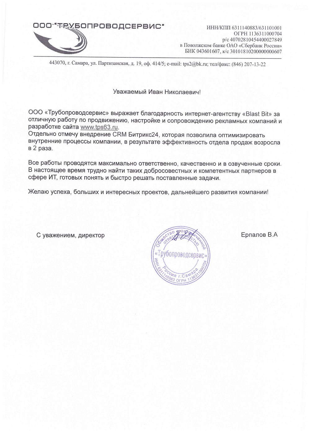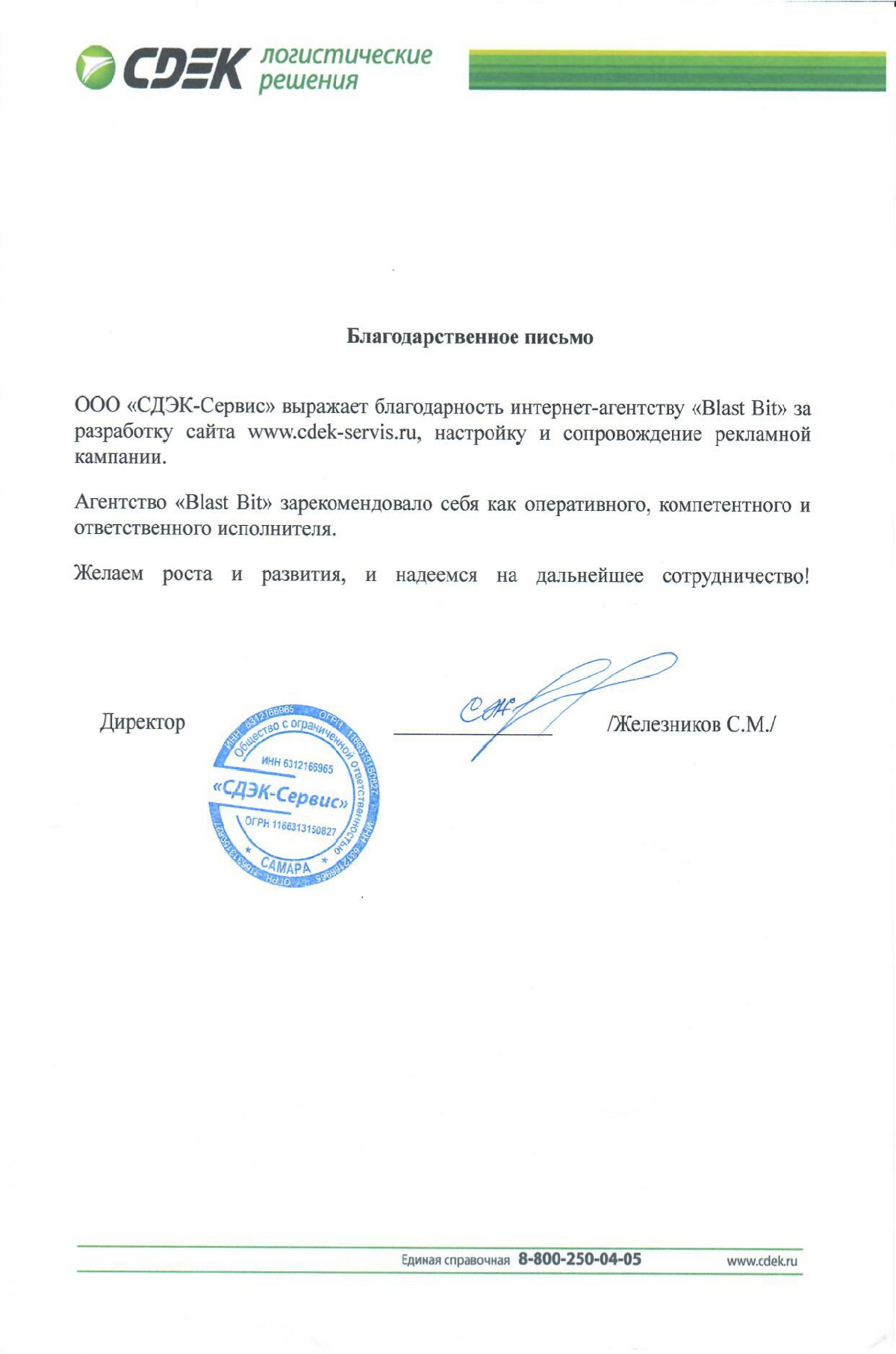 ООО «СДЭК-Сервис» выражает благодарность интернет-агентству «Blast Bit» за разработку сайта, настройку и сопровождение рекламной кампании. Агентство «Blast Bit» зарекомендовало себя как оперативного, компетентного и ответственного исполнителя.