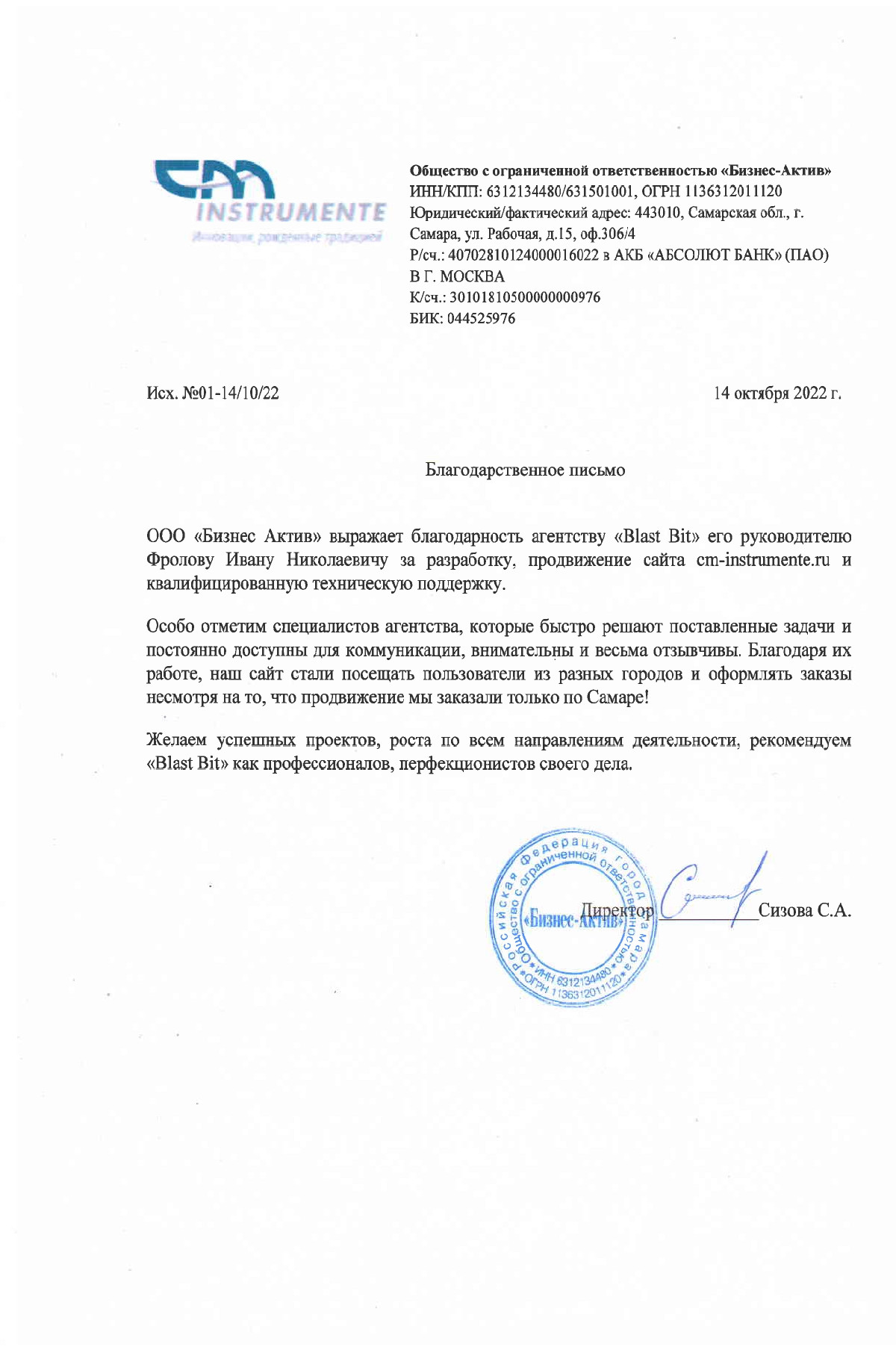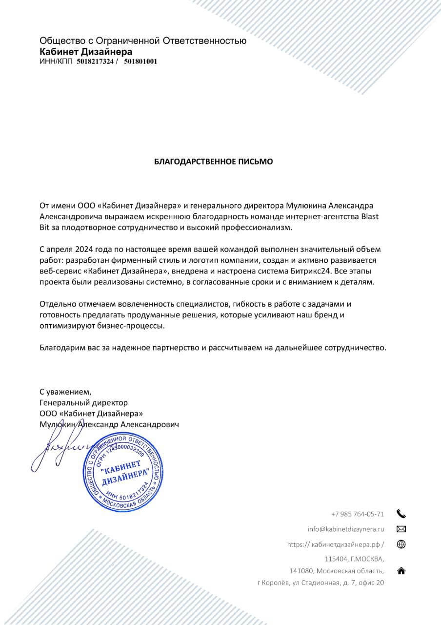 От имени ООО «Кабинет Дизайнера» и генерального директора Мулюкина Александра Александровича выражаем искреннюю благодарность команде интернет-агентства Blast Bit за плодотворное сотрудничество и высокий профессионализм.