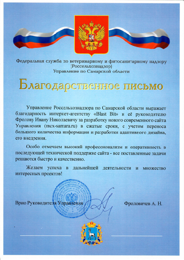 Управление Россельхознадзора по Самарской области выражает благодарность интернет-агентству Blast Bit и её руководителю Фролову И. Н. за разработку нового современного сайта Управления в сжатые сроки с учетом переноса большого количества информации и разработки адаптивного дизайна, его внедрения.