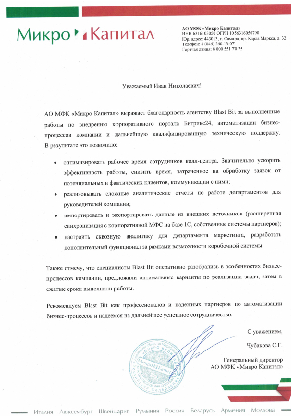 АО МФК «Микро Капитал» выражает благодарность агентству Blast Bit за выполненные работы по внедрению корпоративного портала Битрикс24, автоматизации бизнес-процессов компании и дальнейшую квалифицированную техническую поддержку.