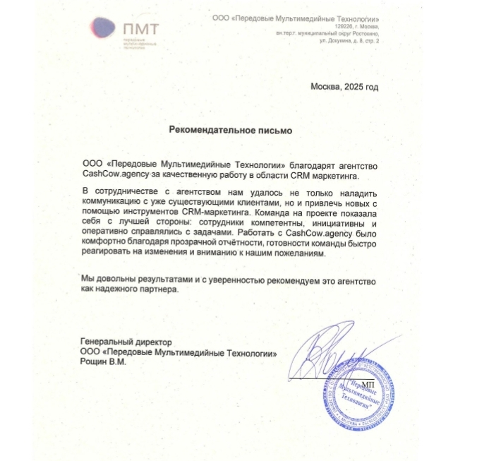 Хочу выразить искреннюю благодарность команде CashCow. agency и в частности Юлии за профессионализм, ответственность и творческий подход к реализации программы лояльности. Несмотря на особенности проекта, всё получилось и мы уже видим положительный эффект. Отдельно хочу отметить, что Юлия всегда был