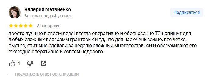 Просто лучшие в своем деле! Всегда оперативно и обоснованно ТЗ напишут для любых сложных программ грантовых и т.д., что для нас очень важно. Все четко, быстро, сайт мне сделали за неделю, сложный, многосоставной, и обслуживают его ежегодно оперативно и совсем недорого.
