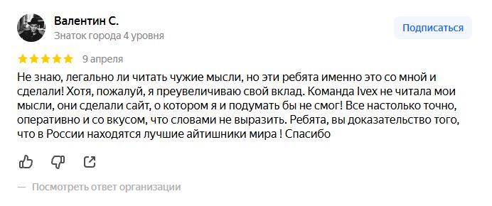 Не знаю, легально ли читать чужие мысли, но эти ребята именно это со мной и сделали! Хотя, пожалуй, я преувеличиваю свой вклад. Команда Ivex не читала мои мысли, они сделали сайт, о котором я и подумать бы не смог! Все настолько точно, оперативно и со вкусом, что словами не выразить.