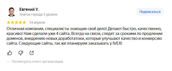 Отличная компания, специалисты знающие своё дело! Делают быстро, качественно, красиво! Нам сделали уже 4 сайта. Всегда на связи, следят за сроками по продлении доменов, внедрению новых доработатоки, которые улучшают качество и конверсию сайта. Следующие сайты, так же планируем заказывать у IVEX!