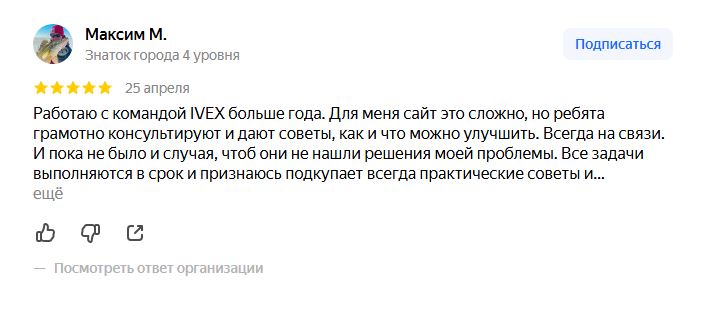 Работаю с командой IVEX больше года. Для меня сайт – это сложно, но ребята грамотно консультируют и дают советы, как и что можно улучшить. Всегда на связи. И пока не было и случая, чтобы они не нашли решения моей проблемы. Ребята креативят и вместе с тобой радеют за твое дело.