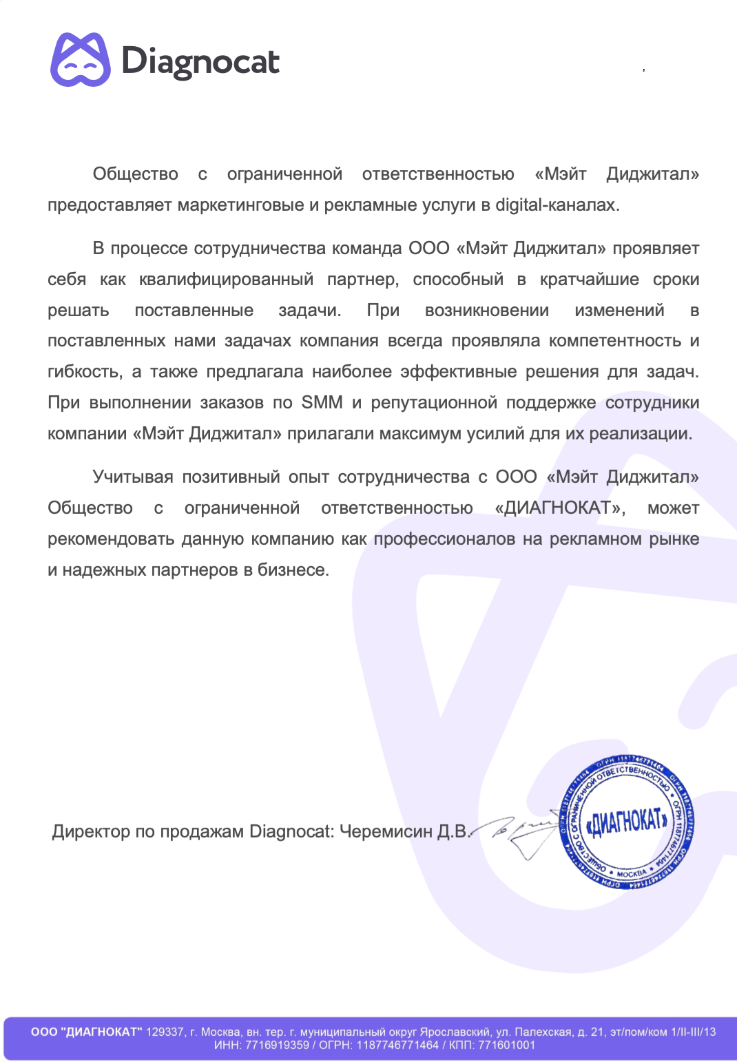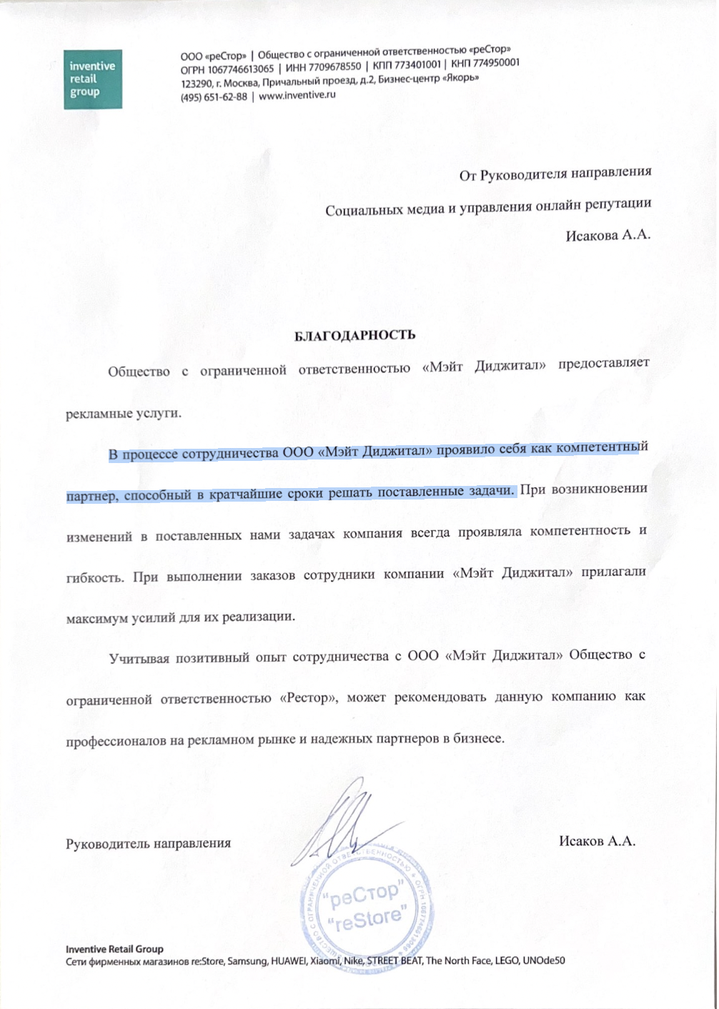 Учитывая позитивный опыт сотрудничества с ООО «Мэйт Диджитал»