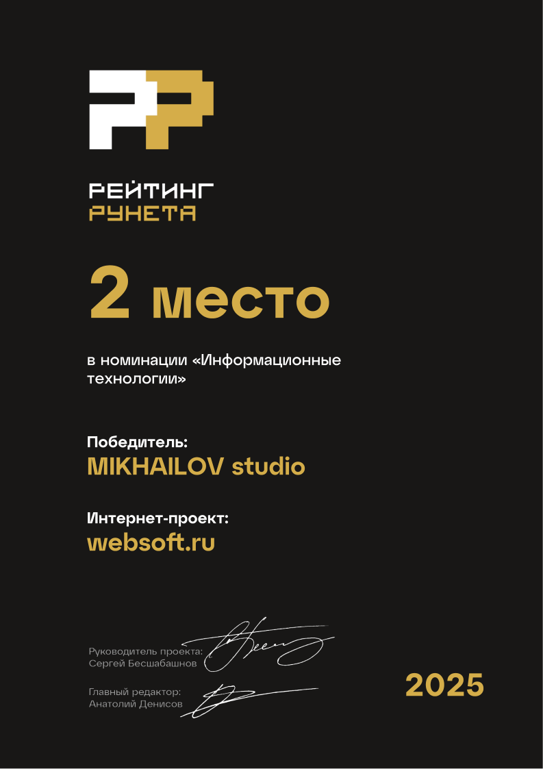 В 2025 году MIKHAILOV studio вошла в топ-3 лучших no-code агентств России по версии Nocode Circle и заняла 13 место из 152-х по России в срезе «Разработчики сайтов и веб-сервисов: простые», другими словами: разработка сайтов для малого и среднего бизнеса.