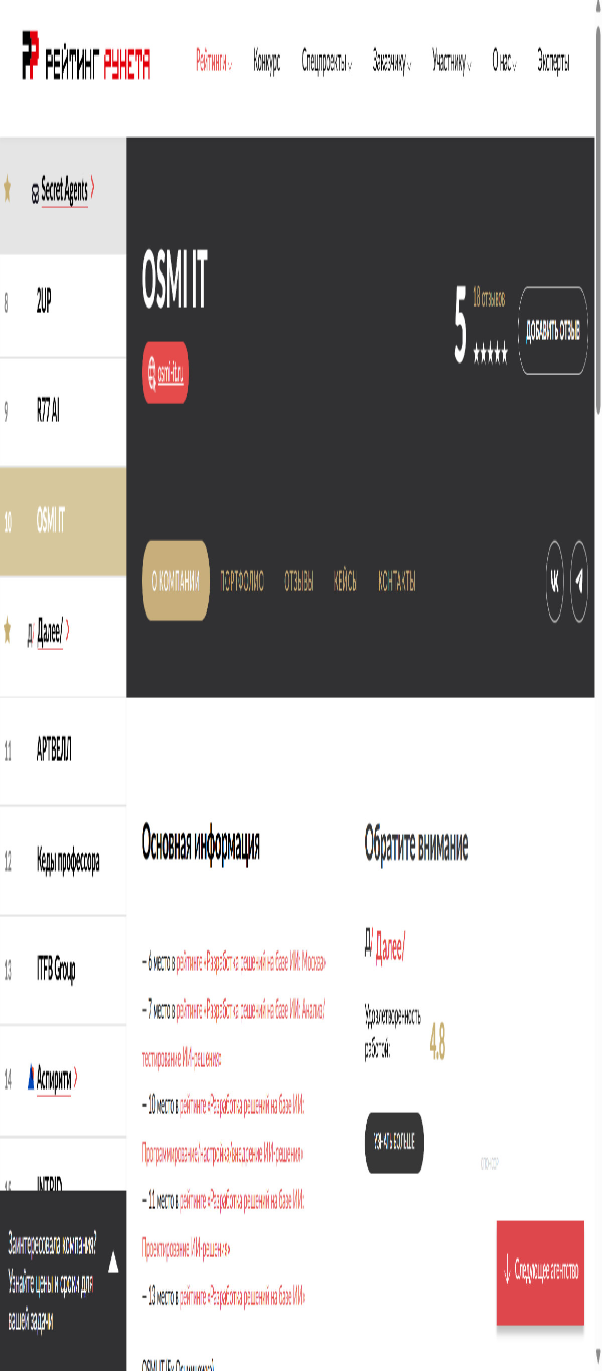 OSMI IT — лидер по созданию Web- и AI-продуктов для среднего и крупного бизнеса. Еще описание: Среди клиентов веб-интегратора — «Росмэн», «Зорге9», «Заслон», «Газпром», «Винета», «Зенит Арена», инвестиционная группа «Абсолют».