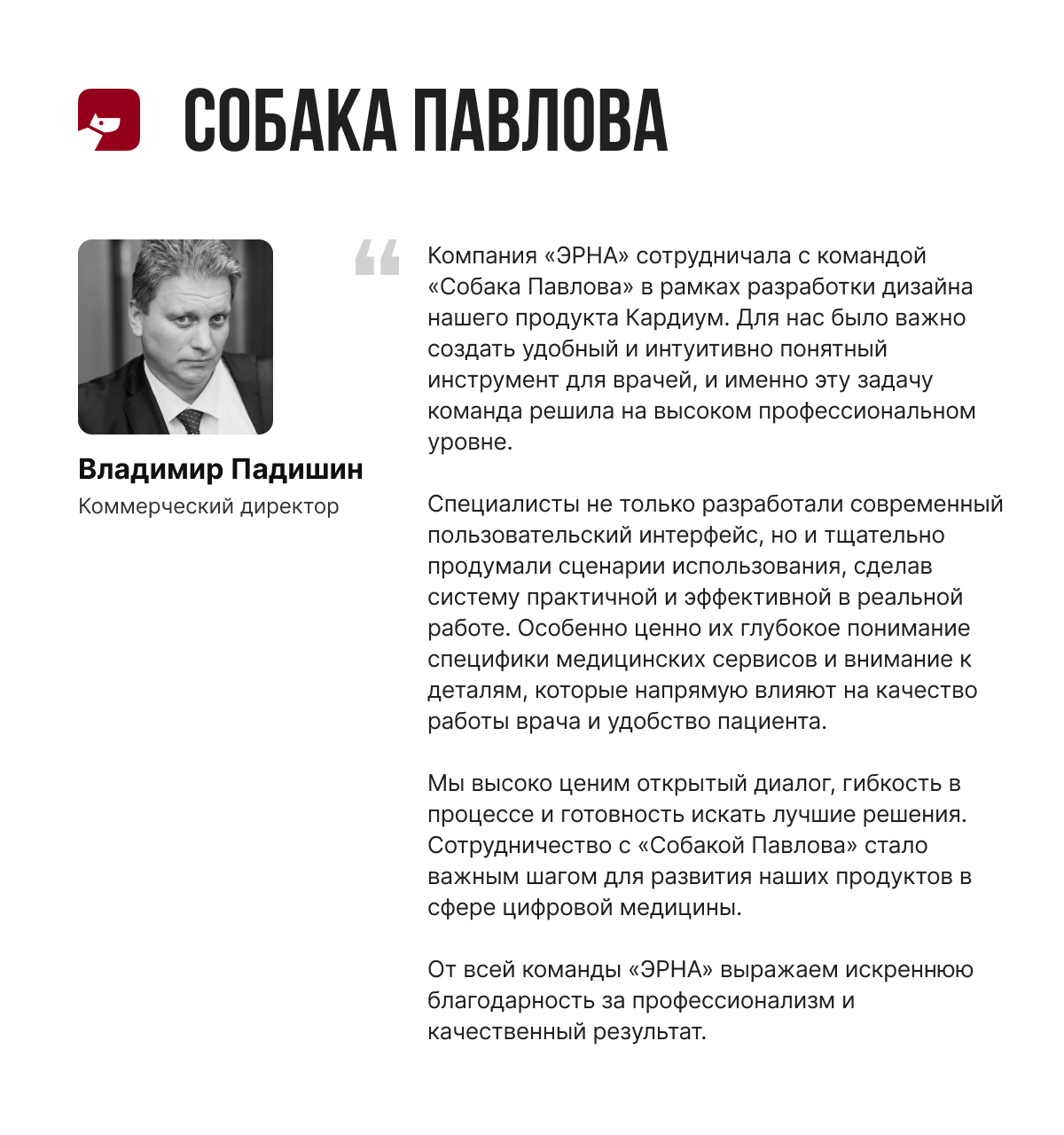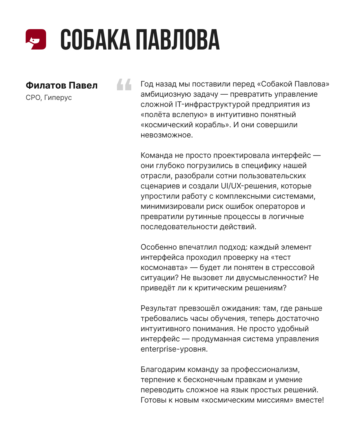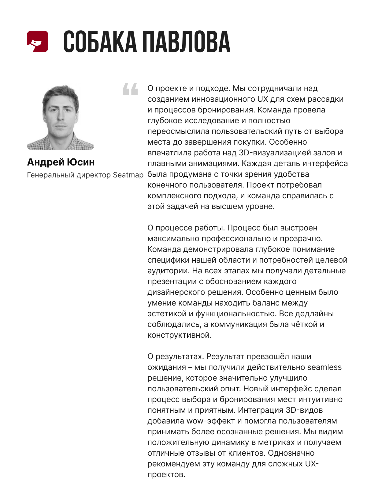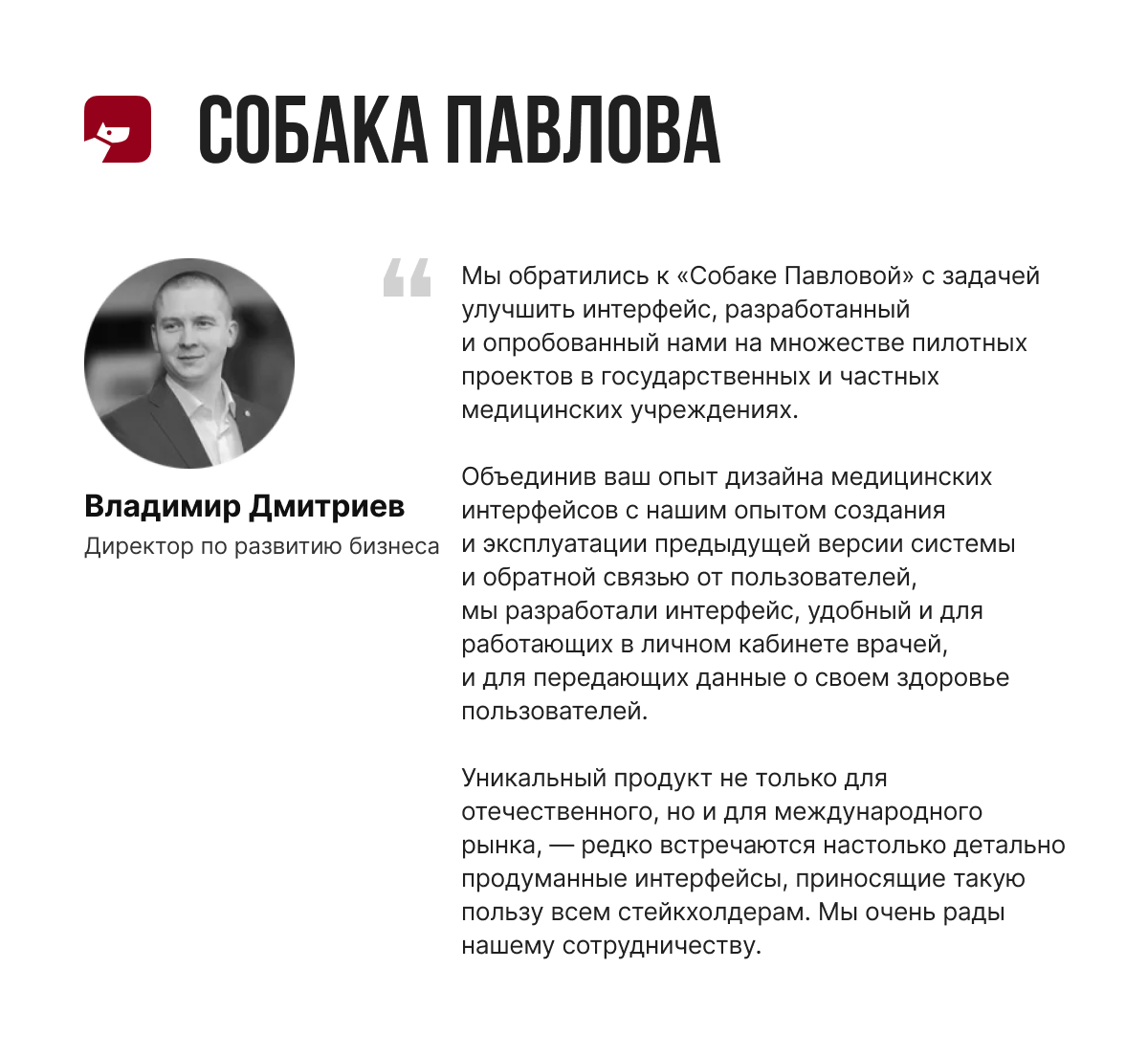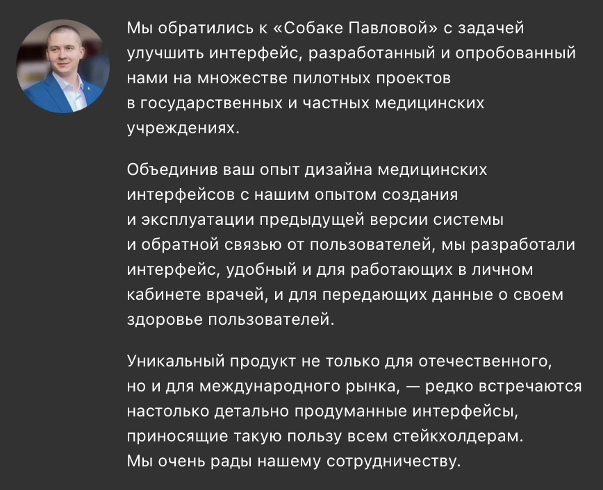 Считаем, сотрудничество с вами помогло нам проанализировать слабые стороны проекта. Сотрудники «Собаки» всегда готовы были общаться, проводить дополнительные встречи, выступали с предложениями по улучшению продукта, и предоставлять оперативно результат. Результатами сотрудничества очень довольны.