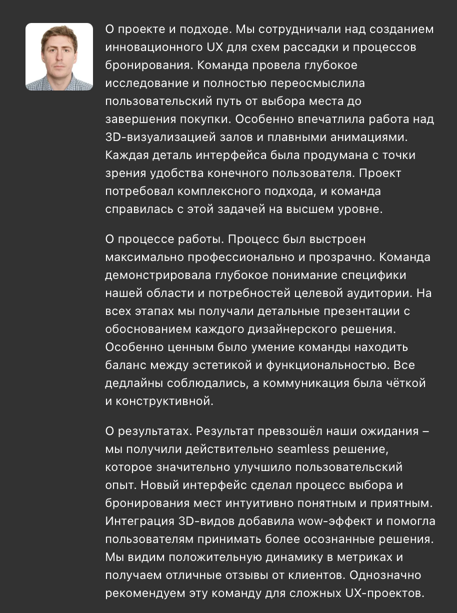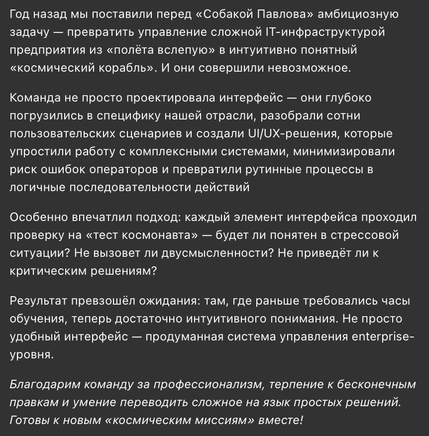 Приятное удивление от того как быстро вы разобрались в смысле нашего продукта и предложили визуально привлекательное решение по полной переработке интерфейса. Организационные процессы также оставили приятное впечатление. Проделана колоссальная бесценная работа, которой мы остались очень довольны.