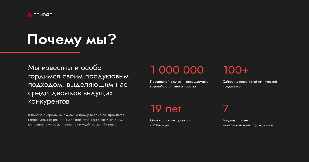 Мы занимаемся продуктовой разработкой и поддержкой web-сайтови приложений более 18 лет.Команда "Триада" решает невыполнимые задачи и меняет рынки своими продуктами. Участвует в разработке ведущих проектов отдельными экспертизами. Реализовывает проекты-лидеры рынка под ключ.Мы известны и особо гордимся своим продуктовым подходом, выделяющим нас среди десятков ведущих конкурентов. В первую очередь мы думаем о продукте клиента, предлагая нетривиальные решения для того, чтобы он