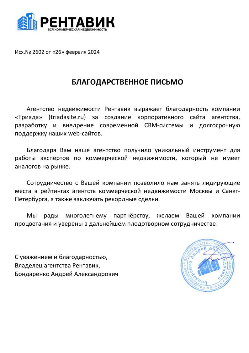 Благодаря Вам наше агентство получило уникальный инструмент для работы экспертов по коммерческой недвижимости, который не имеет аналогов на рынке. Сотрудничество позволило занять лидирующие места в рейтингах агентств коммерческой недвижимости, а также заключать рекордные сделки.