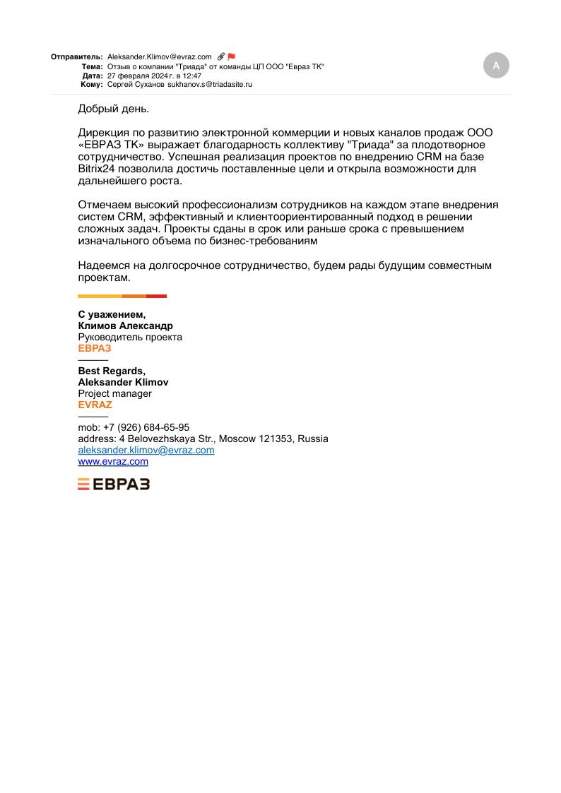 Дирекция по развитию электронной коммерции и новых каналов продаж выражает благодарность коллективу "Триада" за плодотворное сотрудничество. Отмечаем высокий профессионализм сотрудников на каждом этапе внедрения систем CRM. Проекты сданы в срок или раньше с превышением изначального объема.