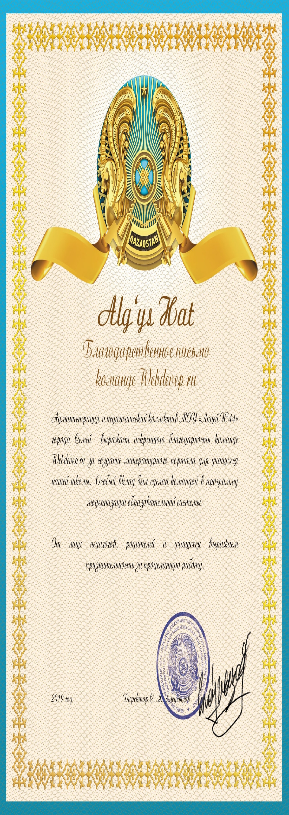 Администрация и педагогический коллектив МОУ "Лицей №44" города Семей выражает искреннюю благодарность команде Webdevep.ru за создание литературного портала для учащихся нашей школы. Особый вклад был сделан командой в программу модернизации образовательной системы. От лица педагогов, родит