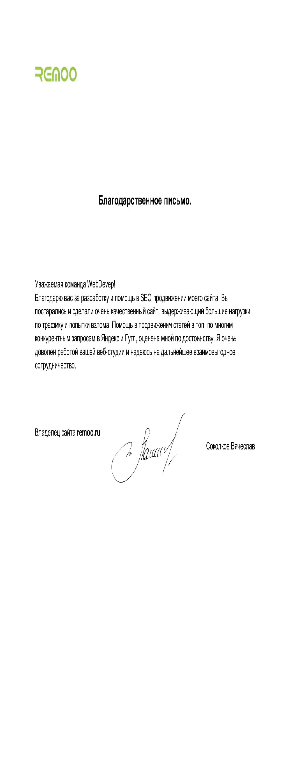 Уважаемая команда WebDevep! Благодарю вас за разработку и помощь в SEO продвижении моего сайта. Вы постарались и сделали очень качественный сайт, выдерживающий большие нагрузки по трафику и попытки взлома. Помощь в продвижении статей в топ, по многим конкурентным запросам в Яндекс и Гугл, оценена мн
