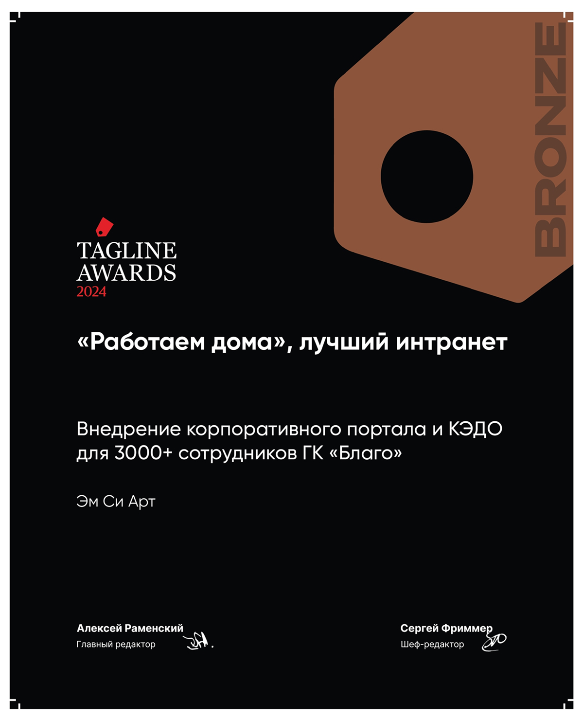 - Бронза в номинации «Работаем дома \ Лучший интранет» на Tagline Awards 2024,