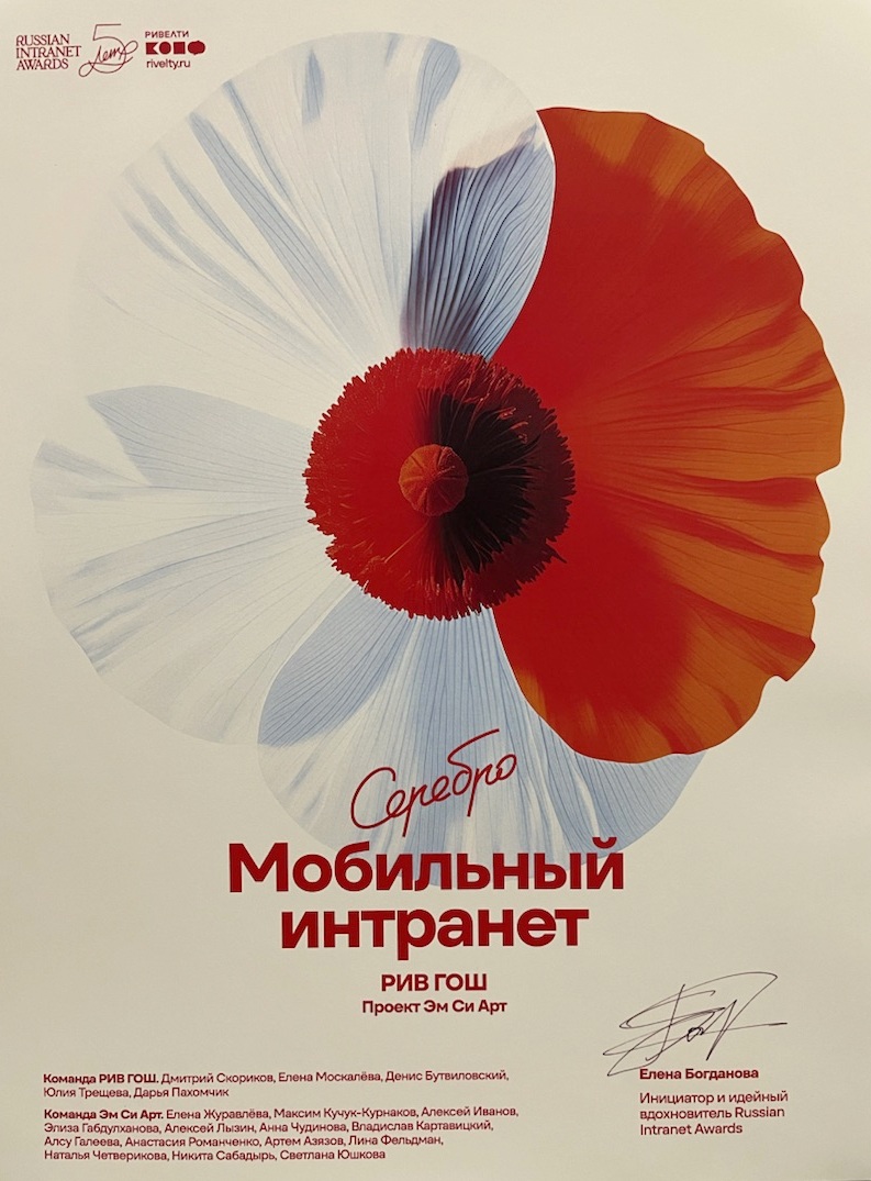 Серебро в номинации «Мобильный интранет», проект внедрения корпоративного портала для «РИВ ГОШ»
